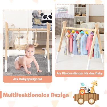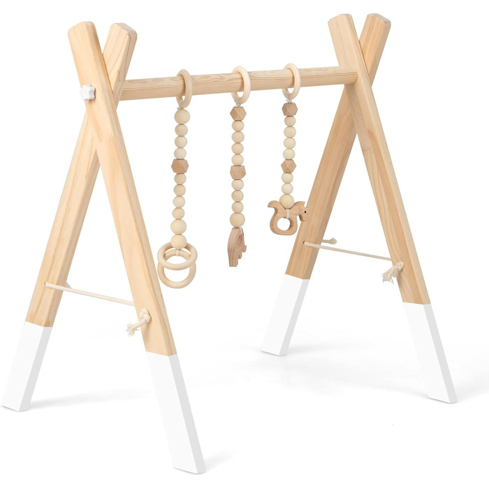 Опис Дерев'яна ігрова трапеція для немовля з 3 іграшковими кільцями та 2 моделями маленьких тварин DREAMADE