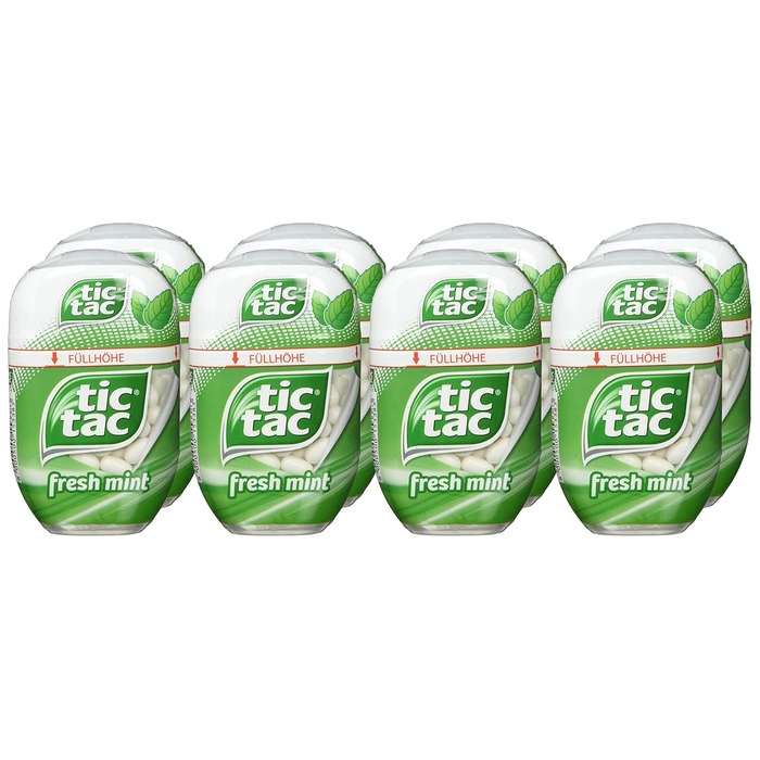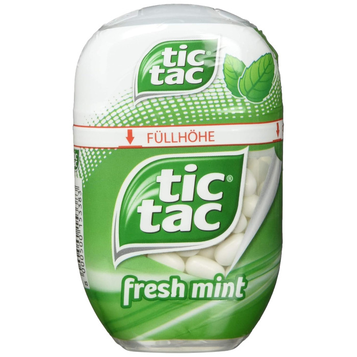Перед побаченням, після вечері, в машині або на роботі - ідеальні помічники, коли справа доходить до освіження дихання. Інформація про продукт: Ніжне дихання, свіжість Тривалий смак Освіжаючий охолоджуючий ефект Без барвників та консервантів Веганський Доступний у двох чудових смаках Про tic tac З тих пір, як tic tac був випущений на ринок в 1969 році, смачні освіжаючі драже користуються великою популярністю. Назва відсилає до