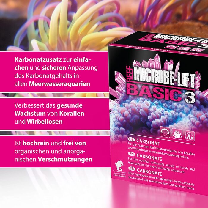MICROBE-LIFT Basic 3 Carbonate – високоякісний порошковий карбонат (KH) для стабілізації карбонатної жорсткості у морських акваріумах. Підтримує оптимальний рівень pH, забезпечує сприятливе середовище для коралів і морських риб. Завдяки високій чистоті формули засіб є безпечним, ефективним і економним у використанні.