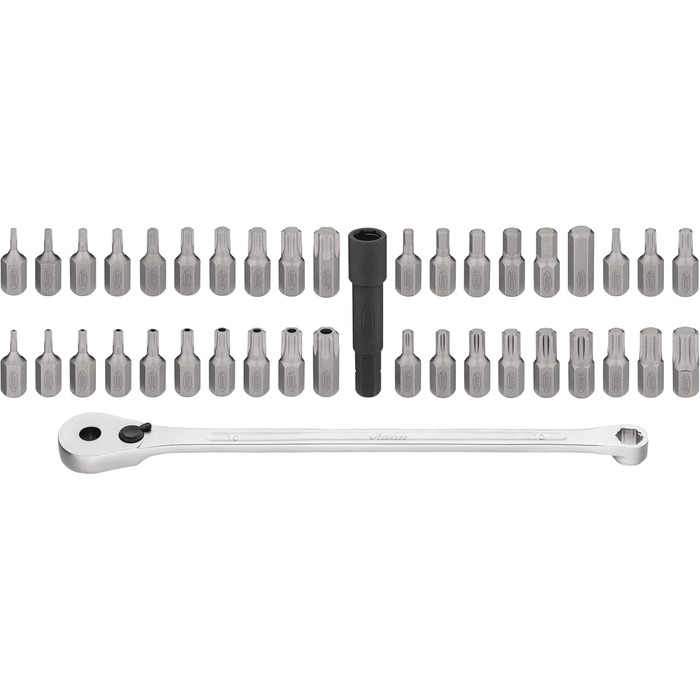 - Легкий доступ до важкодоступних місць: Насадки занурюються в тріскачку → дуже низька висота головки тріскачки. - Асортимент насадок із шестигранником 10 мм. - 2 торцеві головки: - Жорстка сторона для відкручування тугих гвинтових з'єднань - Тримач з храповиком з дрібним зубцюванням на 72 зубці. - Довжина ключа з храповиком: 250 мм.