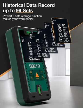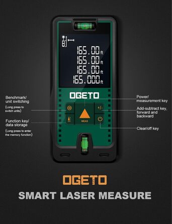 Лазерний далекомір, лазерний далекомір OGETO з РК-підсвічуванням, 99 наборів даних, м/дюйм/фут, Піфагор/вимірювання відстані/площі/об'єму (2*батареї AAA, IP54)