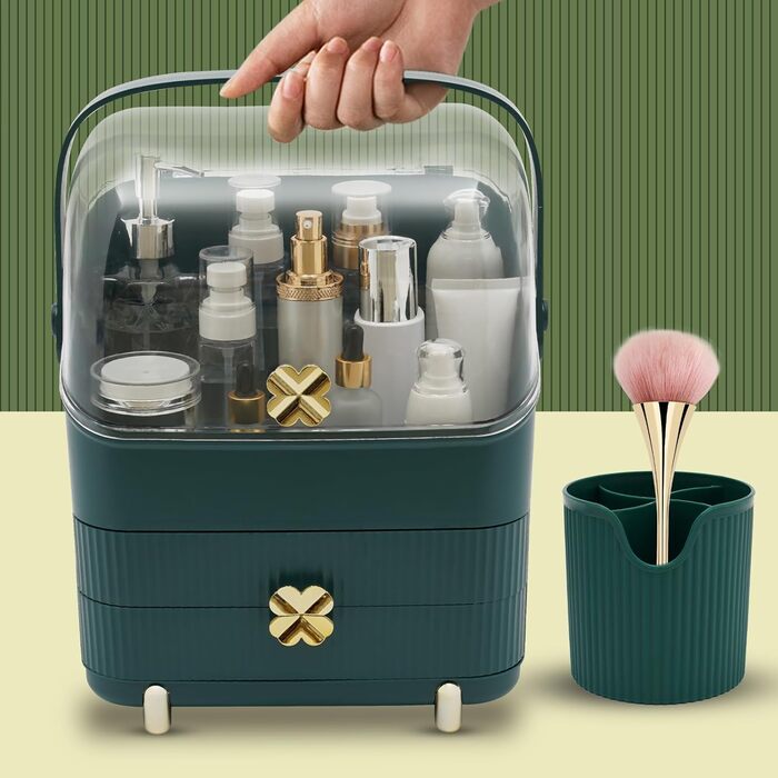 Опис Портативний органайзер для макіяжу Коробка для зберігання косметики Органайзер для косметики Ювелірні помади Столик для макіяжу Косметична коробка з бюстом Бочка та поворотною ручкою для гардеробу Ванна кімната Офіс Зелений