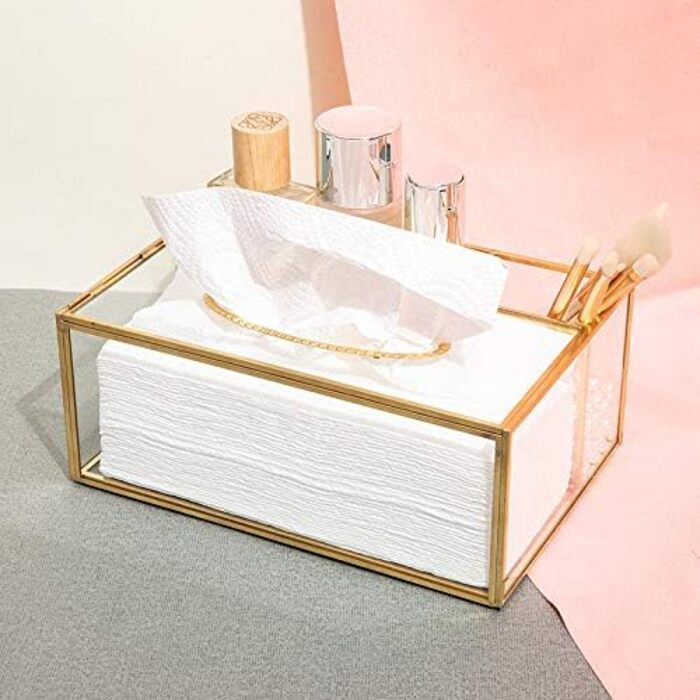 Коробка косметичних серветок SLHEQING Скляна коробка для серветок Органайзер для кавового столика краси з 4 відділеннями для зберігання телефону, пульт дистанційного керування, золотий чохол для коробки з серветками