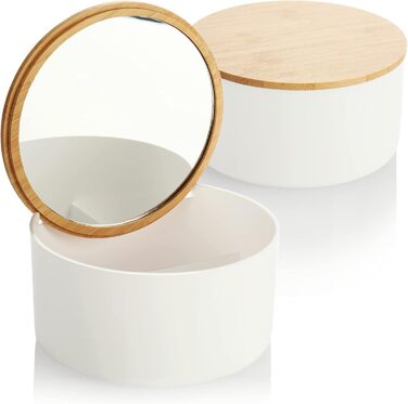 Опис Косметичний органайзер з дзеркалом для макіяжу - Косметична коробка з дзеркалом в бамбуковій кришці - пластикова коробка для зберігання косметики та прикрас (02 шт. - Органайзер для косметики круглий), 2 шт.