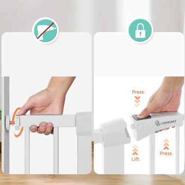 COMOMY пропонує практичне і безпечне дверне огородження для собак та котів, яке легко встановлюється без свердління. Вбудовані дверцята для котів дозволяють домашнім улюбленцям проходити, залишаючи великих собак поза обмеженою зоною. Огородження оснащене системою автозакривання і може відкриватися в обох напрямках до 180°, а при куті відкриття менше 90° закривається автоматично.