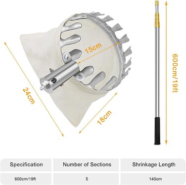 Плодозбірник з телескопічною ручкою та тканинним мішком Плодозбірник з нержавіючої сталі Плодозбірник для збору плодів у важкодоступних місцях на фруктових деревах Плодозбірник для вишні 600 см/19 футів