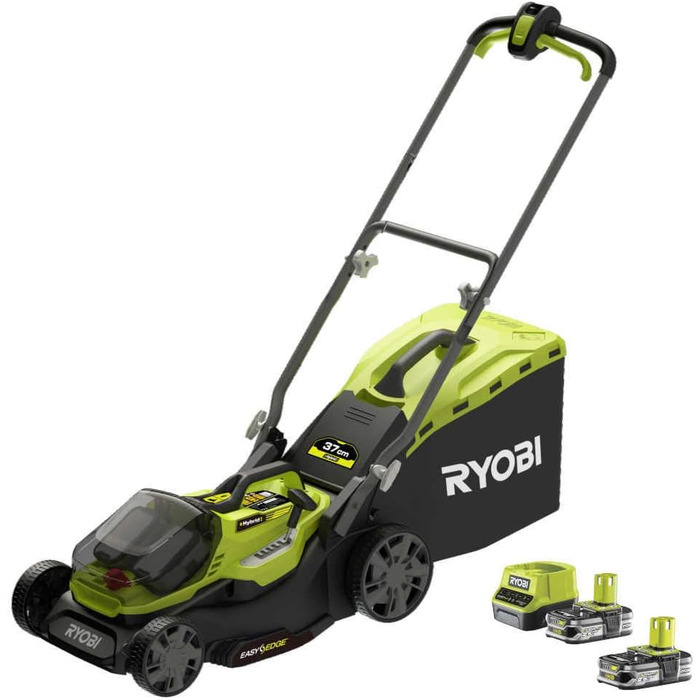 Гібридна газонокосарка Ryobi (живлення від акумулятора / мережі, ширина зрізу 37 см, в комплекті 2 акумулятора 2,5 Ач, травозбірник 45 л, мульчування, регулювання висоти зрізу) RY18LMH37A-225
