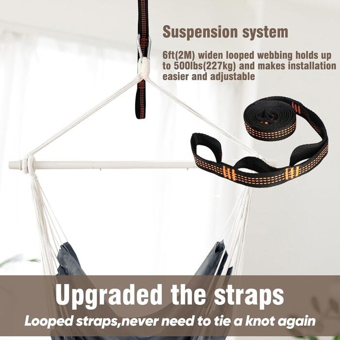 Підвісне крісло-гамак ідеально підходить для використання вдома, на балконі, у саду, на терасі або під час подорожей. Для встановлення оберіть міцну горизонтальну опору (балку, гілку дерева чи металеву конструкцію). Закріпіть ремінь із карабіном, перевірте надійність кріплення, після чого насолоджуйтеся комфортним відпочинком.