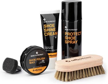 Повний набір ALBATROS Shoe Care, що складається з чорного воску для взуття (50 мл) з губкою-аплікатором, нейтрального крему для взуття Instant Shine (75 мл), гідроізоляційного спрею (200 мл) і щітки для чищення взуття.