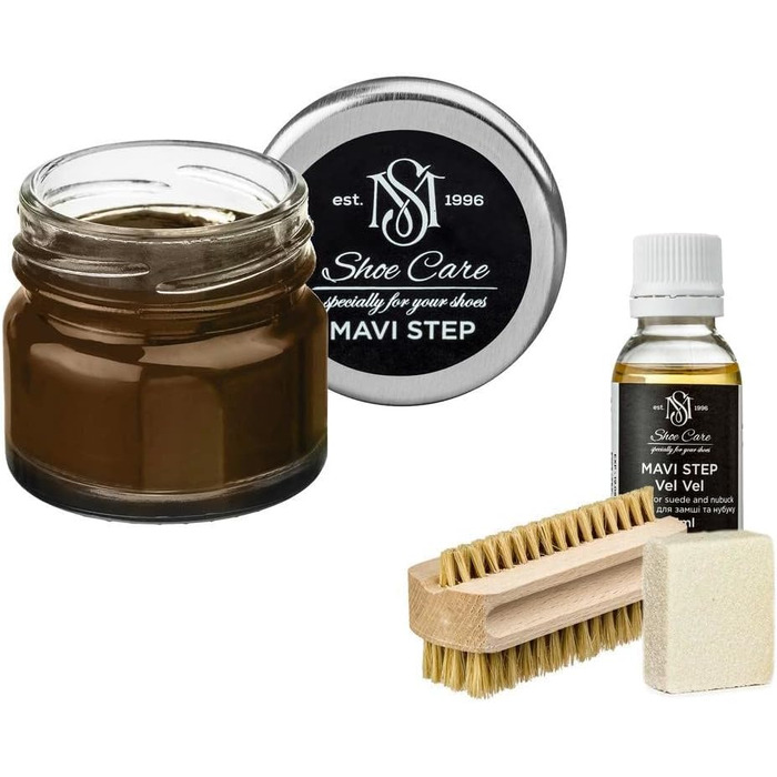 Опис Набір для догляду за взуттям із замші та нубуку MAVI STEP Aurora - Розкішний набір для догляду за взуттям - 152 еспресо, 153 яєчна шкаралупа, один розмір