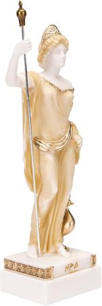 Гера богиня шлюбу, жінок, народження та сім'ї, алебастр, золотий відтінок, 25,4 см. Висота: 25,5 см, ширина: 7 см, глибина: 6 см, вага: 428 г. Матеріал: алебастр. Гера (////////////////////////////////////////////////////////////////////////////////////////////////////////////////////////////////////////////////////////////////Дочка титанів Кроноса та Реї. Гера править на горі Олімп як цариця богів. Гера - оманлива постать, яка служила одночасно і хрещеною матір'ю, і захисницею заміжніх жінок, головуючи на шлюбах і благословляючи чоловіків і дружин. Однією з визначальних характеристик Гери є її заздрісна і мстива натура до численних коханок і позашлюбних нащадків Зевса, а також до смертних, які переходять їй дорогу. Геру часто бачать з тваринами, яких вона вважає священними, зокрема з коровою, левом і павичем. Зображувана величною та урочистою, часто на троні та увінчана поло (висока циліндрична корона, яку носили деякі з Великих Богинь), Гера може тримати в руці гранат, емблему родючої крові та смерті і замінник наркотичної капсули опійного маку. Дослідник грецької міфології Вальтер Керт у своїй книзі "Грецька релігія" пише: "Тим не менш, існують нагадування про більш раннє аніконічне зображення, як стовп в Аргосі і як дошка на Самосі.