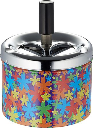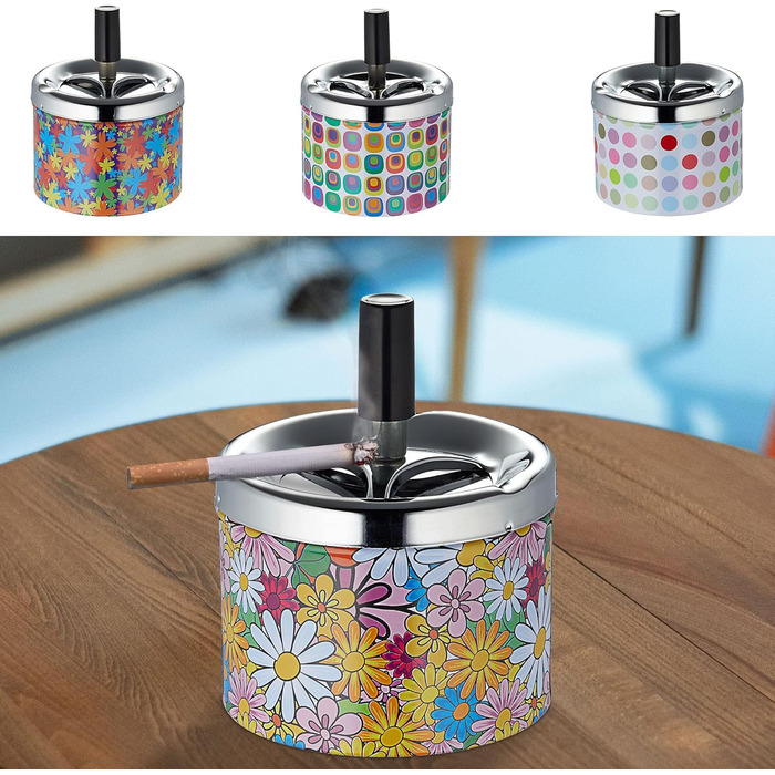 Набір з чотирьох поворотних попільничок у ретро стилі ідеально підійде для столу, бару, бістро, кав'ярні, офісу і може використовуватися як в приміщенні, так і на вулиці. Класичний дизайн прикрашений різноманітними барвистими візерунками, квітами, крапками та графічними фігурами в ретро-стилі. Завдяки вбудованій функції обертання, недопалки та залишки попелу можна акуратно транспортувати всередину попільнички одним натисканням кнопки, при цьому неприємні запахи не поширюються. Попільничку можна розмістити в різних місцях, і її дуже легко чистити, оскільки вона виготовлена з нержавіючої сталі.