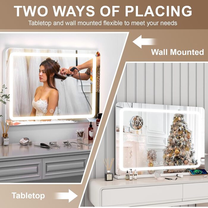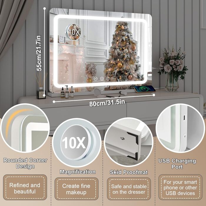 Дзеркало для макіяжу Dradaomull з підсвічуванням, велике голлівудське дзеркало з USB і 10-кратною лупою, 3 кольори світла, настінне дзеркало, настільне дзеркало для макіяжу - 80x55см (біле) Біле - 80см 55см