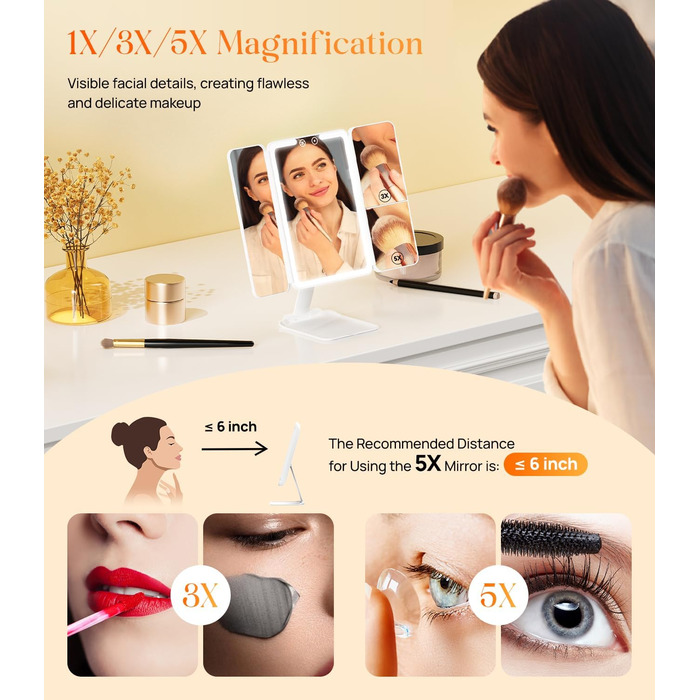 Дзеркало для макіяжу Gospire з підсвічуванням, портативне косметичне дзеркало зі збільшенням /3X/5X, потрійне складне дзеркало для подорожей, настільне дзеркало з 3-колірним затемненням/розумним датчиком, біле