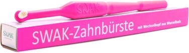 SWAK - Догляд за зубами з мізками Зубна щітка SWAK - це симбіоз традиційної зубної щітки Miswak і ергономічно оптимальної форми ручки, виготовленої з пластику на біологічній основі. Головка невелика, щоб зуби можна було звільнити від нальоту точно, ретельно і дбайливо. Деревина кореня має природну антибактеріальну дію і містить численні активні інгредієнти, такі як природні фториди, силікати, а також не менше 70 інших корисних для здоров'я інгредієнтів. Зубна щітка SWAK - це злиття традиційного засобу для догляду за зубами Miswak і сучасної щітки з одним пучком. Щетиниста головка («маленька голова») зубної щітки SWAK виготовлена з м'яковолокнистої деревини «дерева зубної щітки» Місвак (salvadora persica L.), яка широко поширена в чагарникових степах Африки, Сходу та Ост-Індії.