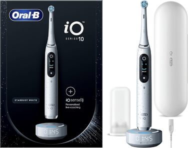 Опис Акумуляторна електрична зубна щітка Oral-B iO 10, датчик тиску, інтерактивний дисплей, штучний інтелект з живим тренуванням, 1 насадка для щітки, 1 зубна щітка, дорожній футляр, білий, ідея для подарунка
