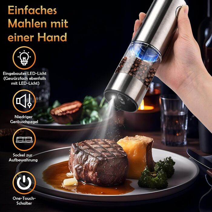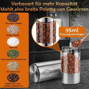 Електричні млини для солі та перцю MILFECH з нержавіючої сталі, набір з 2 шт. , з прозорою основою для зберігання, маленькою щіткою та маленькою деревяною ложкою (срібло), KYMQ-32A-H52-BS-BXG