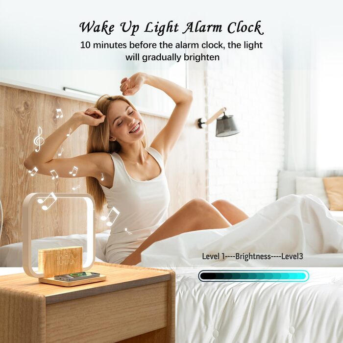 Ніжна лампа з функцією заряджання, бездротовий зарядний пристрій 10 Вт, світло для пробудження, 10 природних звуків, які допоможуть вам заснути, і настільна лампа з сенсорним регулюванням яскравості з 3 рівнями яскравості для спальні, вітальні, офісу