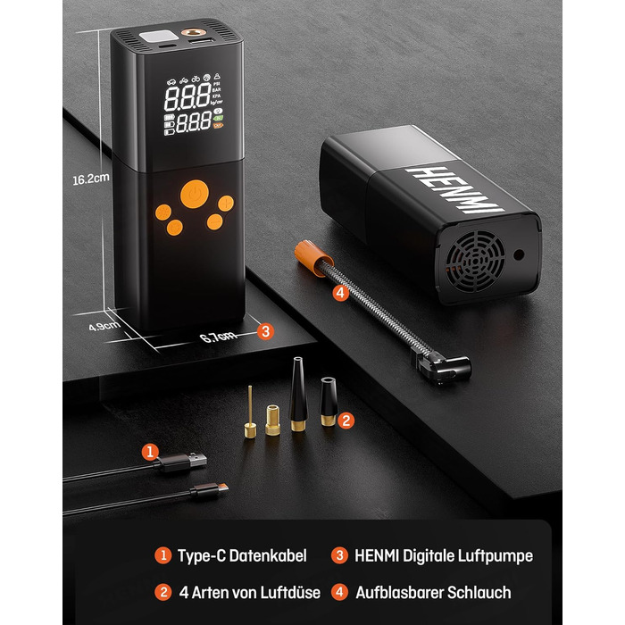 Портативний велосипедний електричний повітряний насос HENMI, 150 фунтів на квадратний дюйм (10,3 бар) 6000 мАг 5-режимний акумуляторний компресор із цифровим дисплеєм Манометр для велосипедів, автомобілів, мотоциклів, м'ячів