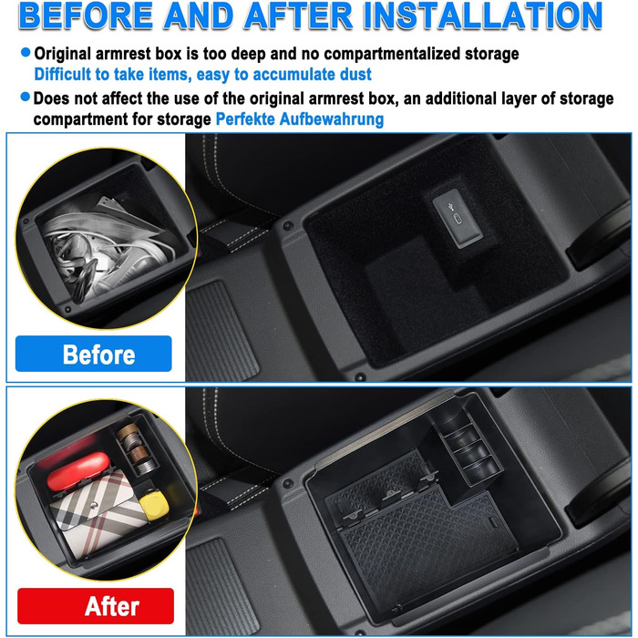 Опис Сумісний з VW Passat B8 2015-2023 (від 11/2014, Type 3G) Центральна консоль Підлокітник Ящик для зберігання Центральний підлокітник Органайзер Лоток Багатофункціональний бардачок (чорний)