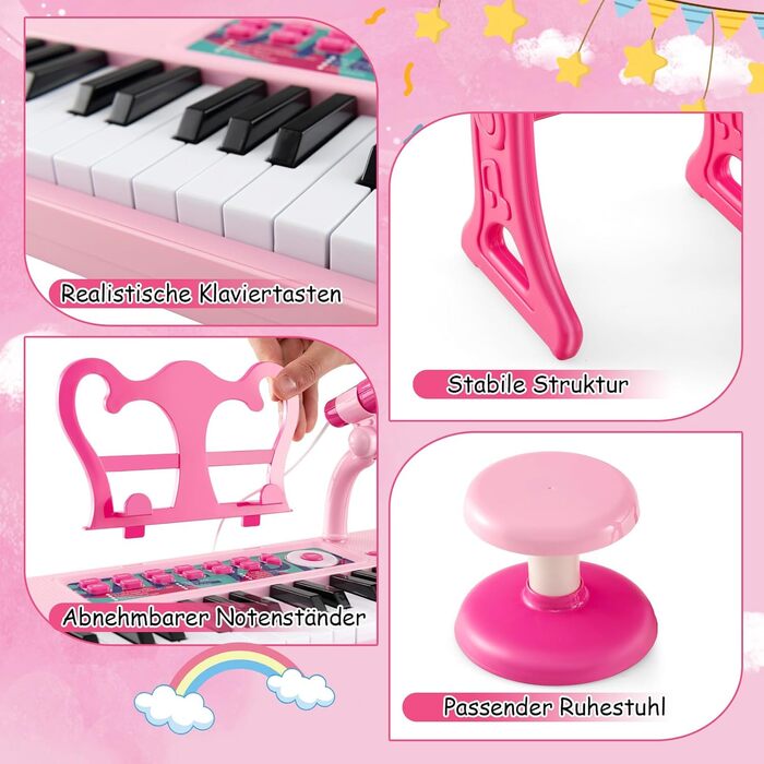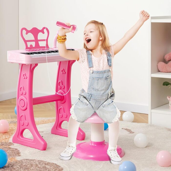 Дитяча клавіатура COSTWAY 37 клавіш, дитяче піаніно електронне зі стільчиком, мікрофоном та пюпітром, дитяче піаніно зі знімними ніжками, клавіатура піаніно для дітей від 3 років (рожева)