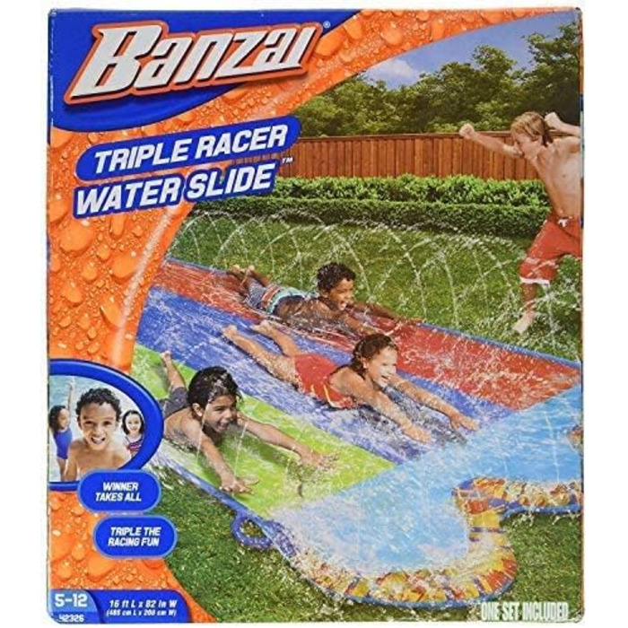 Banzai Triple Racer Water Slide — це яскрава гірка з трьома доріжками для захоплюючих літніх перегонів. Довжина майже 5 метрів дозволяє дітям влаштовувати динамічні змагання, а великий басейн у кінці забезпечує м’яке приземлення. Вбудований розбризкувач зволожує поверхню, роблячи ковзання ще швидшим, а у комплекті є 3 надувні дошки для ще більшого задоволення від гри.
