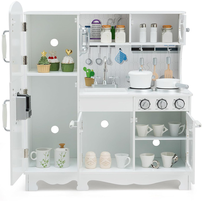 Дитяча кухня DREAMADE з дерева з ігровими аксесуарами, дитяча ігрова кухня з холодильником мийкою плитою духовкою, дерев'яна іграшкова кухня, ігрова кухня зі світлом і звуком для дітей віком від 3 років, біла