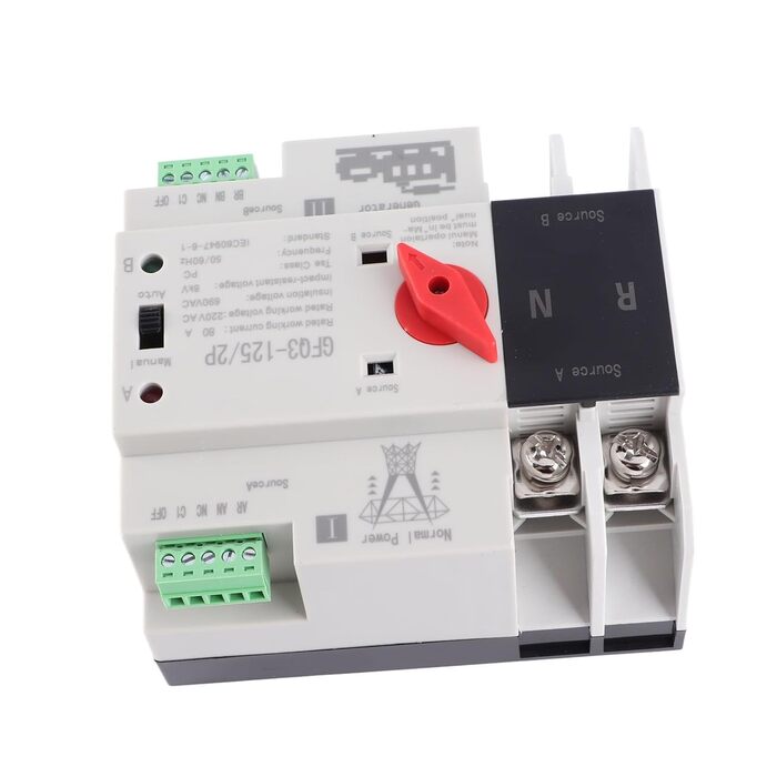 Автоматичний перемикач передачі (ATS) призначений для надійного управління переходом між основним і резервним джерелом живлення. Монтаж на DIN-рейку забезпечує зручне встановлення в електрощиті, а подвійна полярність 2P і номінальний струм до 80 А гарантують безпечну роботу при великому навантаженні.