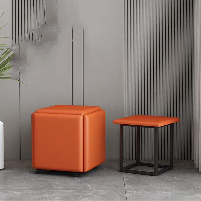 Представляємо інноваційний пуф-куб 5-в-1, який стане ідеальним рішенням для економії простору у вашій оселі. Цей трансформер легко перетворюється з однієї компактної софа-табуретки на п'ять окремих місць для сидіння. Завдяки яскравому поєднанню помаранчевої та чорної екошкіри та інтегрованим коліщаткам, він поєднує практичність, мобільність і сучасний стиль.