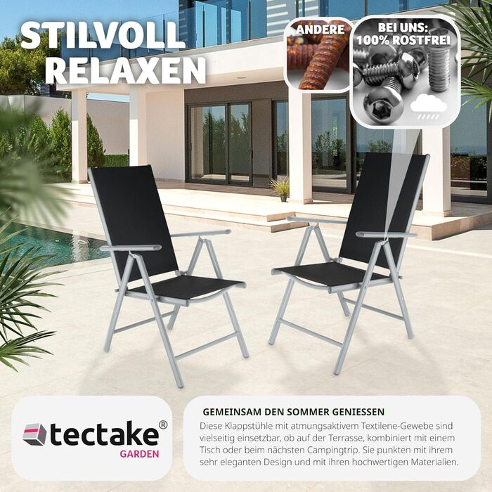 Садові крісла tectake Tracy — це ідеальне поєднання легкості, міцності та комфорту. Завдяки алюмінієвому каркасу з антикорозійним покриттям вони стійкі до вологи та сонця, а синтетична сітчаста тканина забезпечує вентиляцію та комфорт у спеку. Спинка регулюється у семи положеннях, що дозволяє обрати найзручніший кут для відпочинку. Крісло легко складається, займає мінімум місця при зберіганні та підходить як для дому, так і для подорожей чи кемпінгу.
