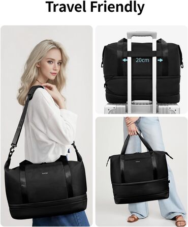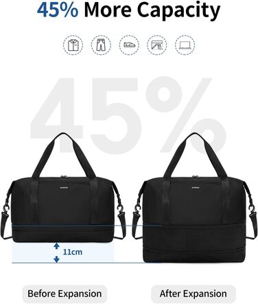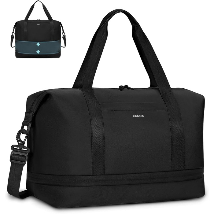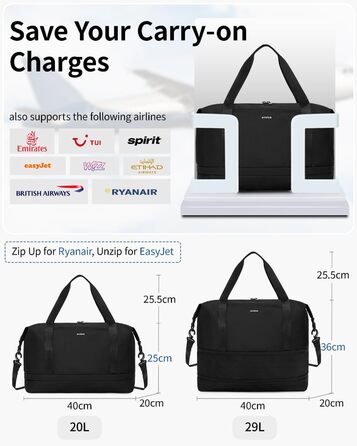 Розширювана ручна поклажа Ryanair 40x20x25, Дорожня сумка для ручної поклажі зі знімним мокрим мішком, сумка для ручної поклажі для літака, вихідного дня для жінок та чоловіків, патент на стадії розгляду (чорний)