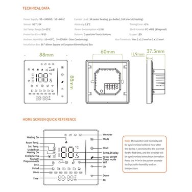 Кімнатний термостат, щотижневе програмування, підтримує сенсорне керування/мобільний додаток, голосове керування, сумісний із Alexa/Google Home, для електричної теплої підлоги 16A, чорний