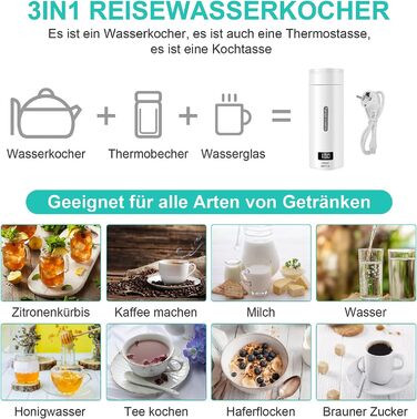 Туристичний чайник маленький, електрична чашка для води, нагрівальна кружка для швидкого приготування 220 В 300 Вт з регулюванням температури, з автоматичним відключенням для подорожей (шнур живлення всередині кружки) білий