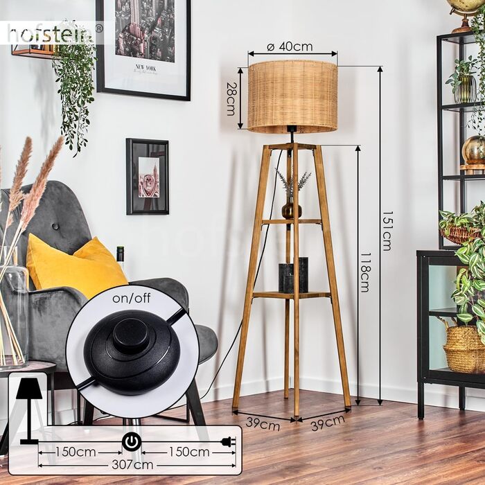Опис Торшер Cavaca, торшер з дерева/ротанга в натуральних кольорах, світильник в скандинавському дизайні з круглим абажуром (Ø 40 см), полички і ножний вимикач, висота 151 см, 1 х Е27, без лампочки