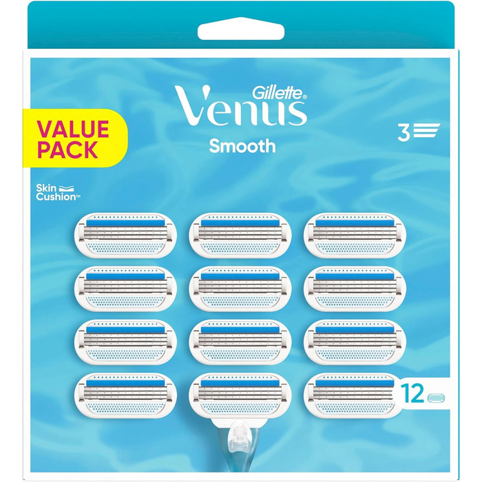 Леза бритви Gillette Venus Smooth для жінок, 12 змінних лез для жіночих бритв з 3 лезами, що підлаштовуються під контур тіла, оточені захисними подушками