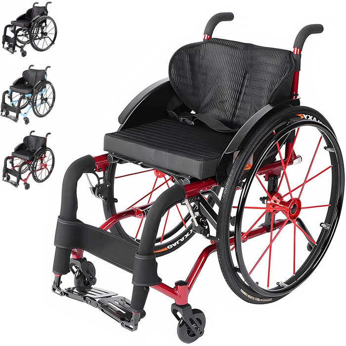 Опис Складна легка активна інвалідна коляска Bueuwe, маленька інвалідна коляска для дому та вулиці, надзвичайно вузька інвалідна коляска з амортизацією, надлегка туристична візка, алюміній, червоний, ширина сидіння 38 см ширина сидіння червоний