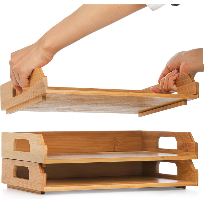 Набір Okllen з 3 штабельованих бамбукових паперових мисок стане чудовим доповненням до будь-якого робочого місця. Кожен лоток має розміри 33 см Д х 25,4 см Ш х 4,4 см В, а при складанні для створення 3-ярусної полиці він має розмір 17,5 см В.