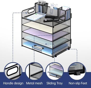 Опис Настільний органайзер SUPEASY з 5 полицями, ручкою та 3 тримачами для ручок, сітчастий органайзер для паперу/файлів для столу, лоток для паперових листів для канцелярського приладдя, 2 шт. и (чорний) 5 полиць, чорний, 2 шт. и 2 упаковки