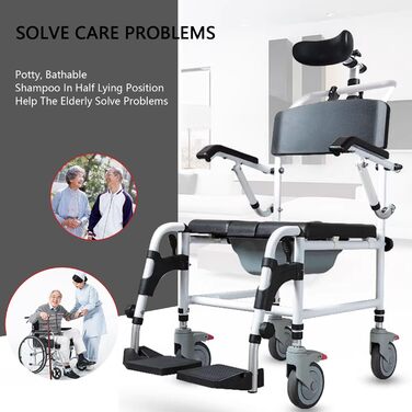 Опис Крісло для душу ZAANU з підголівником, душ/туалет/крісло для транспортування з підлокітниками та спинкою, інвалідна кабіна з нахилом 45, нічні туалети для людей похилого віку