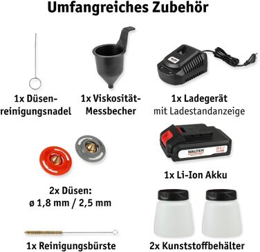 Літій-іонний акумуляторний фарборозпилювач WALTER, бездротовий, для легкого та зручного фарбування, з м'якою ручкою для комфорту, для вимогливих майстрів, у комплекті акумуляторна батарея, голки для чищення сопел та стакан для вимірювання в'язкості
