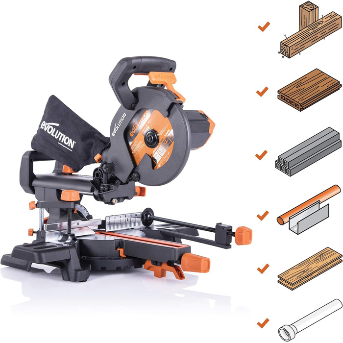 Розсувна торцювальна пила Evolution R210SMS 1500 Вт, 230 мм, функція розсування, різання під кутом, кути підрізу Твердосплавне / TCT пиляльне полотно Ø 210 мм для різання різних матеріалів Розсувна торцювальна пила R210-SMS
