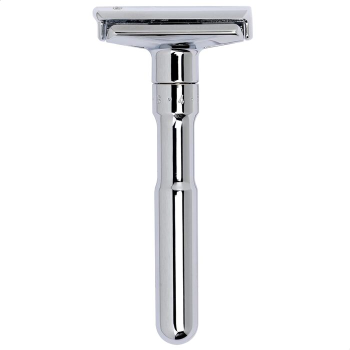 Безпечна бритва MERKUR Futur 701 Дизайн класичний глянсовий хром Бритва прямого різу, що складається з двох частин Ідеально підходить для вологого гоління Цинкове лиття під тиском Латунна рукоятка Зроблено в Німеччині