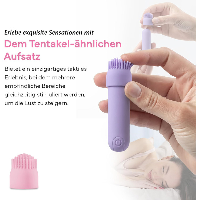 У комплекті є три насадки для різноманітних відчуттів: «вушка кролика» для ніжного тремтіння, насадка-щіточка для м’яких дотиків та насадка з кінчиком-тентаклем для більш екзотичної стимуляції. Виготовлений із високоякісного медичного силікону, цей вібратор є безпечним, гіпоалергенним і приємним на дотик.